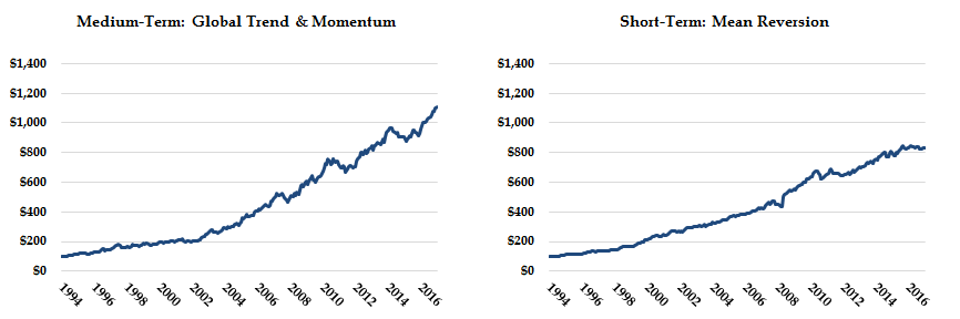 As an example of how Multi-Dimensional Portfolio diversification works, we can start with the equal-weighted Traditional Portfolio outlined above and add two simple, evidence-based strategies that focus on different time frames and opposing market dynamics.