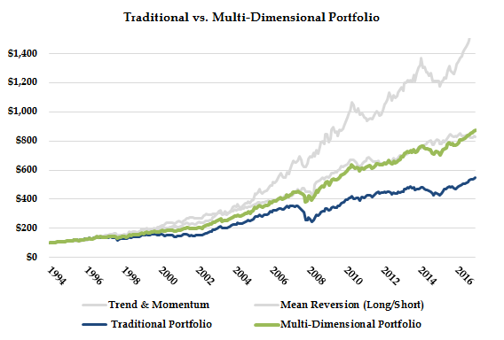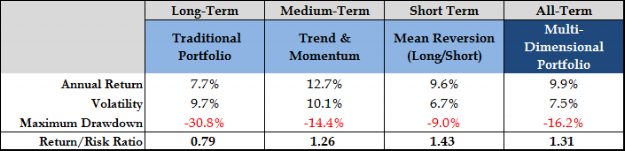 Multi-Dimensional Portfolios rely on a much broader array of diversified return streams, which derive their profits from multiple market factors, including long-term mean reversion (i.e. value investing), long-term global growth, medium-to-long-term trend following, intermediate-term momentum, short-term mean reversion, statistical arbitrage, etc. Each of these factors, or classes of strategies, have proven to be statistically persistent return generators over extensive periods of time. Moreover, as each of these strategies seeks to profit from a different set of market dynamics (i.e. trend following vs. mean reversion; momentum vs. value investing; buying vs. short selling), they tend to zig and zag at different times and in different market environments, by their very nature. As such, these Multi-Dimensional strategies tend to have very low correlations with one another, and therefore, are ideal candidates for building robust portfolios that can generate more consistent and reliable returns than any individual strategy or return factor.