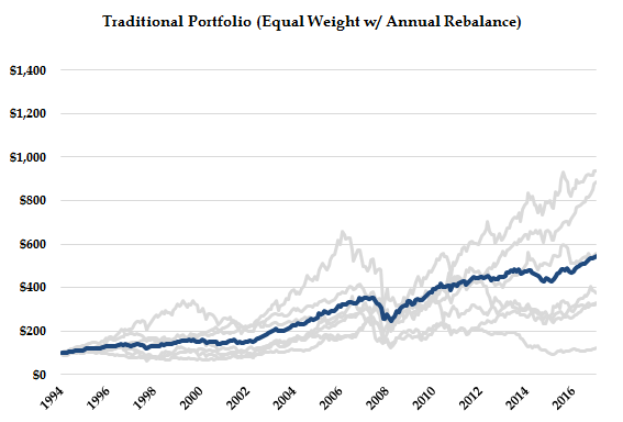 As an alternative, by combining each of these Traditional return streams into a more balanced portfolio, investors can diversify away much of their downside risk and portfolio volatility, while keeping the bulk of their returns over time. The evidence for this can be seen in the Traditional Portfolio chart below, which equally weights each asset class listed and re-balances the portfolio at the end of each calendar year. By investing in and adhering to this simple portfolio from 1995-2017, investors would have realized an annualized return of roughly 7.7 percent, nearly 80 percent of the return from U.S. stocks. Moreover, the portfolio's maximum decline over the same period would have been almost half the downside experienced in U.S. stocks and other correlated asset classes. This would have made it much easier for investors to remain rational and maintain focus on the long-term plan when times were tough.