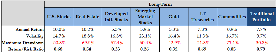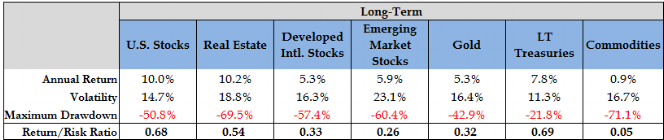 As indicated in the charts above, nearly all the major asset classes produced attractive annualized returns over the past 20+ years. However, each asset class also experienced fairly prolonged periods of peak-to-valley equity declines (or maximum drawdowns) during times of economic recession or financial crisis, for which most exceeded 50 percent (i.e. their value was cut in half, or more). It is these large and prolonged periods of negative growth that cause the most distress and anxiety for investors, often driving them to abandon each of these investments at the worst possible time.