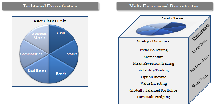 Properly diversifying a portfolio is standard practice and extensively implemented across the investment management industry. Portfolio managers, financial advisers, and individuals alike use diversification as an instrumental tool to improve the overall risk-adjusted performance of their portfolios over time. Yet, most investors only diversify across a limited set of return streams, more specifically, traditional asset classes such as U.S. stocks, international stocks, real estate, bonds, and commodities. We call this more limited diversification style Traditional Diversification, and we firmly believe there is plenty of room for improvement. Such improvement could be accomplished by expanding into other return streams which are not only diversified across asset classes, but also across time frames and strategy dynamics - a method we call Multi-Dimensional Diversification.