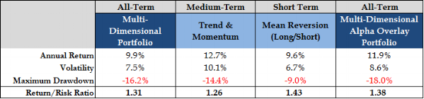 As can be seen in Figures 3 and 4, the addition of the Short-Term Mean Reversion and Intermediate-Term Global Trend and Momentum strategies as alpha overlays would have increased annual returns from less than 8% to nearly 10%, modestly increased portfolio volatility, and left maximum peak-to-valley drawdown (i.e. the extent of downside volatility) essentially unchanged. As a result, the overall portfolio's Return/Risk ratio increased from 0.79 to 0.94, meaning the alpha overlays would have successfully enhanced the portfolio's absolute and risk-adjusted returns.