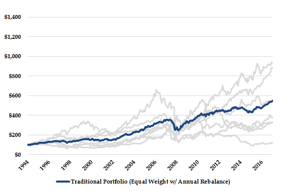 Figure 2: Traditional Portfolio and Component Asset Class Equity Curves (1995-2017)