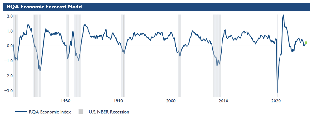 The RQA Economic Forecast Model represents a consolidated composite of key economic leading indicators and market-based explanatory variables. The goal of this composite model is to present a holistic measure of primary U.S. economic growth drivers and their trends over time. (Additional detail on the model’s construction is provided here.)